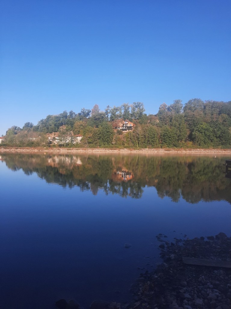 Um 9 Uhr verlasse ich den Campingplatz über eine große Wiese, die an einem See liegt. Das Wasser ist ruhig und die Reflektionen faszinieren mich.