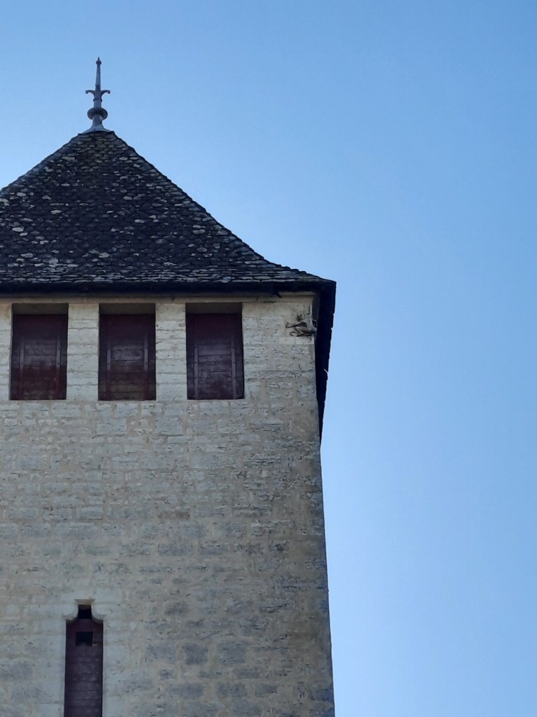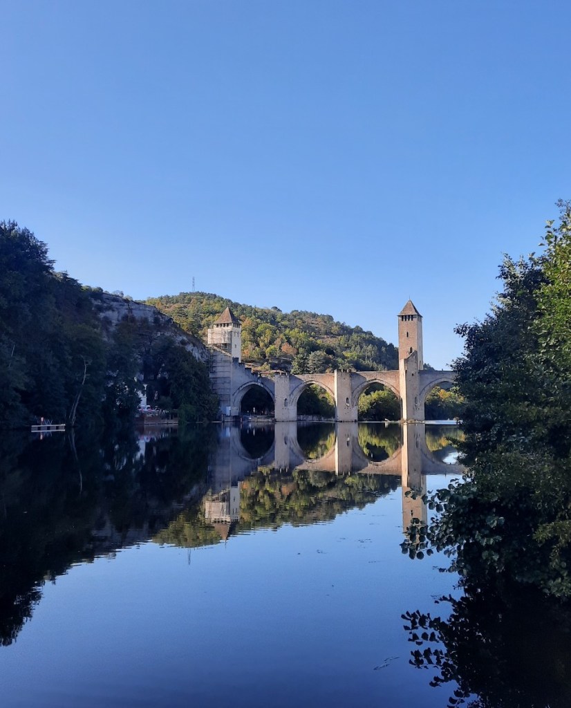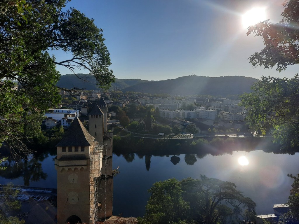 Motiviert starte ich in den Wandertag. Durch die Stadt hindurch verlasse ich Cahors über die bekannte Brücke Valentré. Am mittleren Turm ist oben eine steinerne Satansfigur angebracht. Es gibt die Legende, dass der Teufel bei der Fertigstellung geholfen hat.