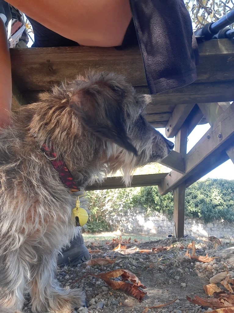 In Lascabanes setze ich mich an einen Picknicktisch, ein alter Dackel kommt vorbei und mag gestreichelt werden. Sein Fell ist ganz zerstrubbelt und er erinnert mich an einen übergroßen Igel.