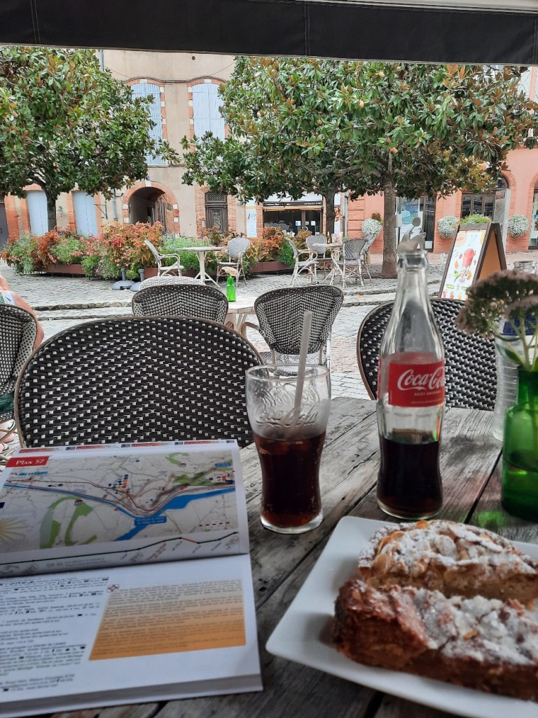 Auch nach Moissac ist es nicht mehr weit. Die Stadt ist größer als die meisten auf dem Weg und gut zwei Kilometer folgen wir der Hauptstraße ins Zentrum. Der erste Stopp ist bei der Touristeninformation, und endlich kann ich den gewünschten Pilgerführer erwerben. In einem Café teilen wir uns einen Mandel- und einen Apfelkuchen und rufen Unterkünfte für die Nacht an.