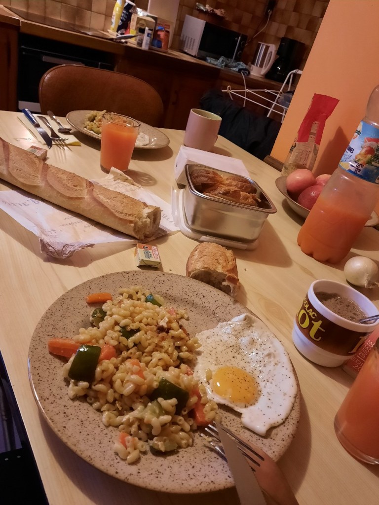 Die Nacht war sehr ruhig und dennoch bin ich zig Mal aufgewacht. Um 7:30 Uhr bereiten wir Frühstück vor. Es gibt angebratene Nudeln und Gemüse vom gestrigen Abend, Spiegelei, Baguette und Brioche. Vollgefuttert verlassen wir die schöne Unterkunft um 9:30 Uhr.
