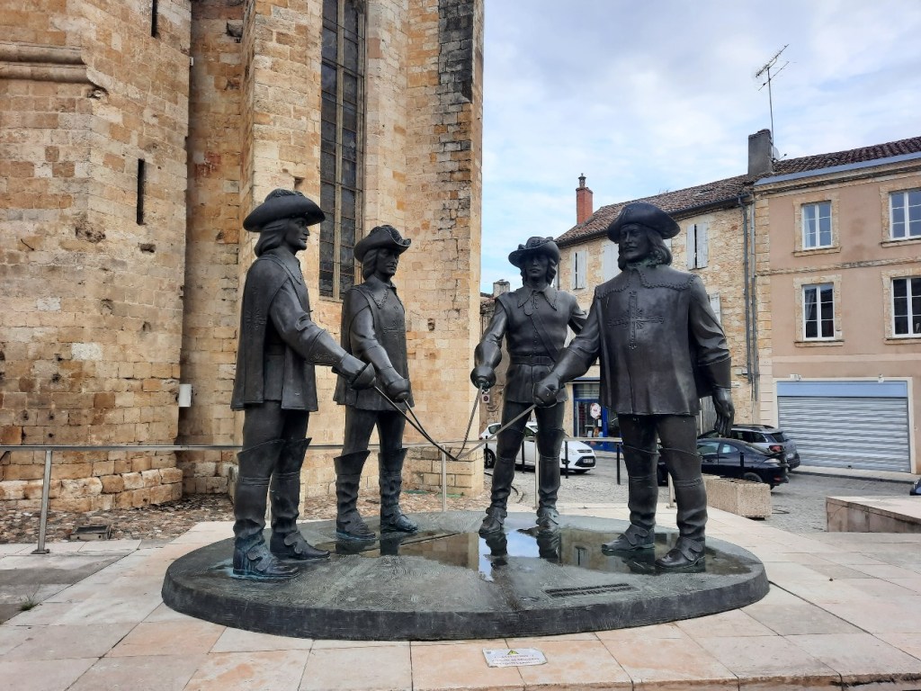 Außerdem freue ich mich darauf alleine zu laufen und durchquere einmal die Stadt Condom. An der Kirche stehen Bronze-Statue von D’Artagnan und seinen drei Musketieren.