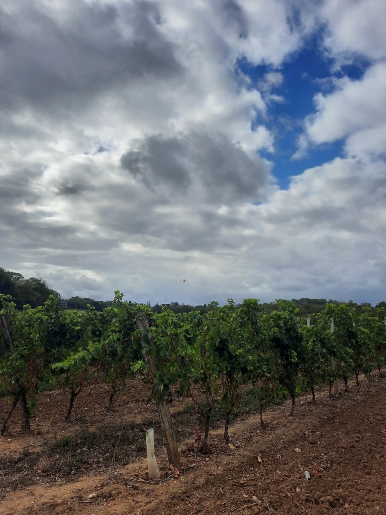 Die Wind ist stark und eine dunkle Wolkenwand kommt auf mich zu, kurz vor dem Etappenziel fängt es an zu schütten.