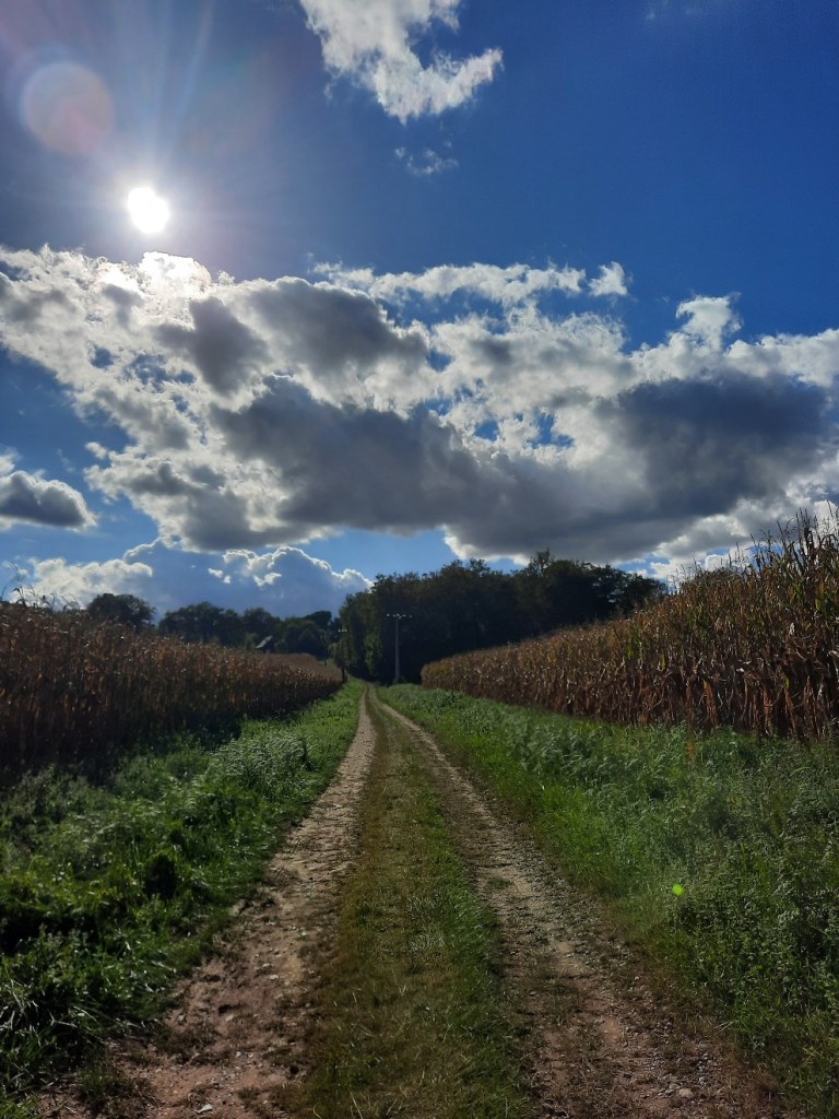 Die Szenerie ist in der ersten Hälfte des Tages wenig spektakulär. Die braunen Felder in der flachen Landschaft in Kombianation mit einer ruhigen Landstraße, die lange Zeit geradeaus führt, ist anstrengend zu laufen.